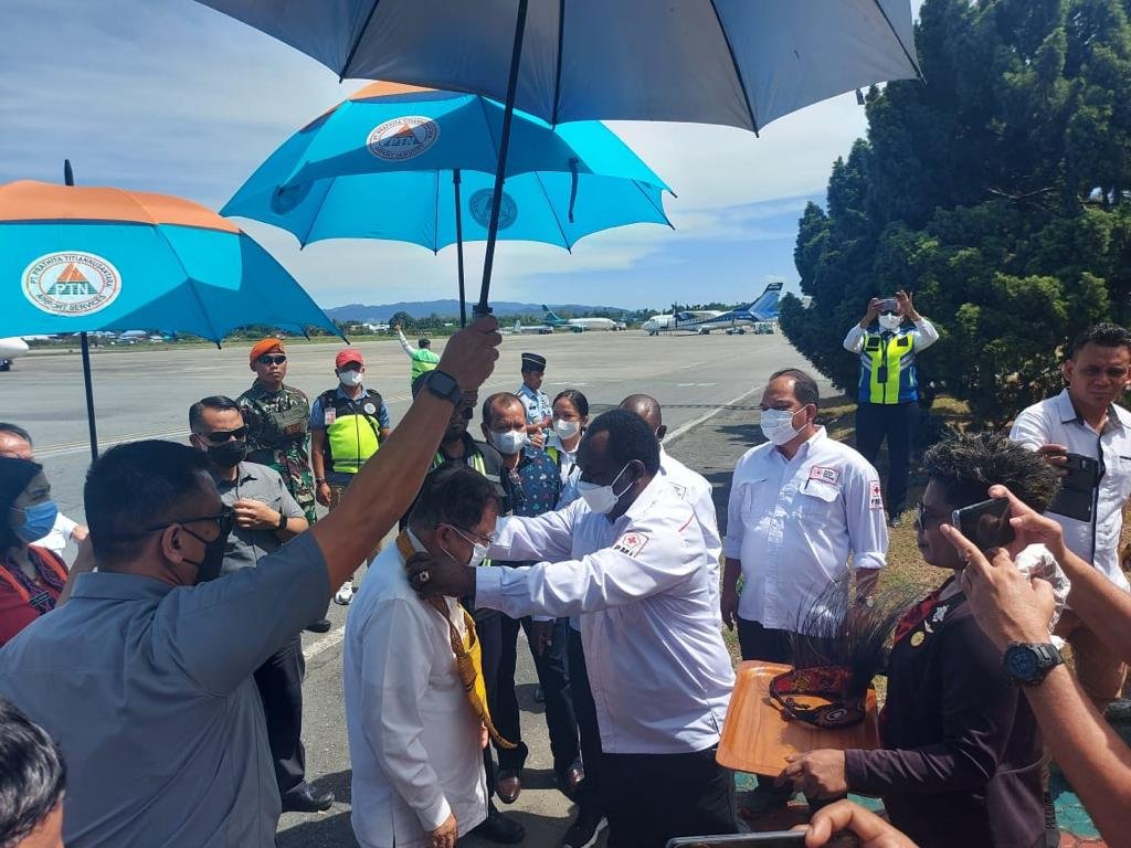 Kedatangan JK di Bandara Bandara Sentani, Kabupaten Jayapura disambut langsung Ketua PMI Papua, Zakius Degei beserta sejumlah pengurus. Zakius kemudian mengenakan kerajinan khas Papua berupa Tas Noken Anggrek dan Mahkota Kepala dari Bulu Kasuari sebelum bertolak menuju lokasi pelantikan.